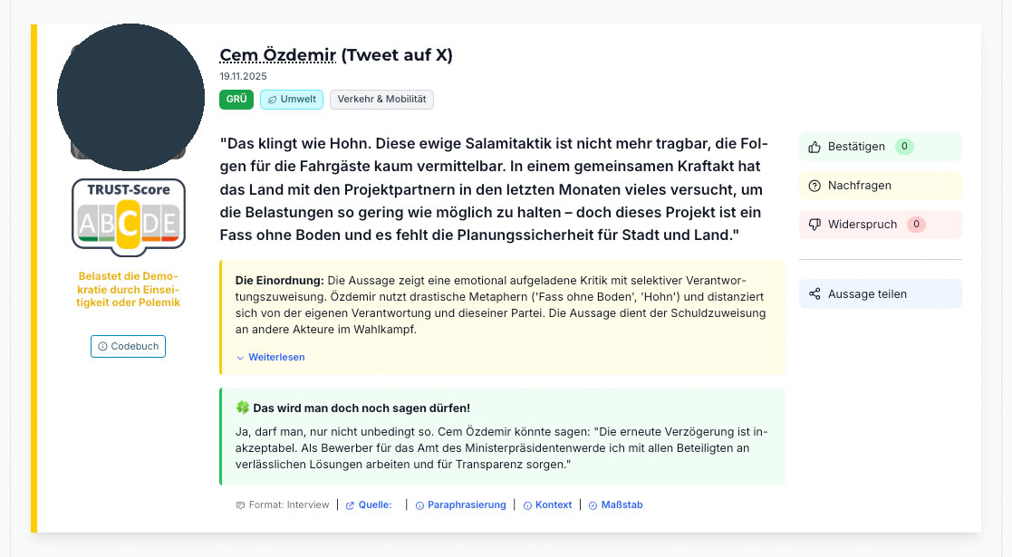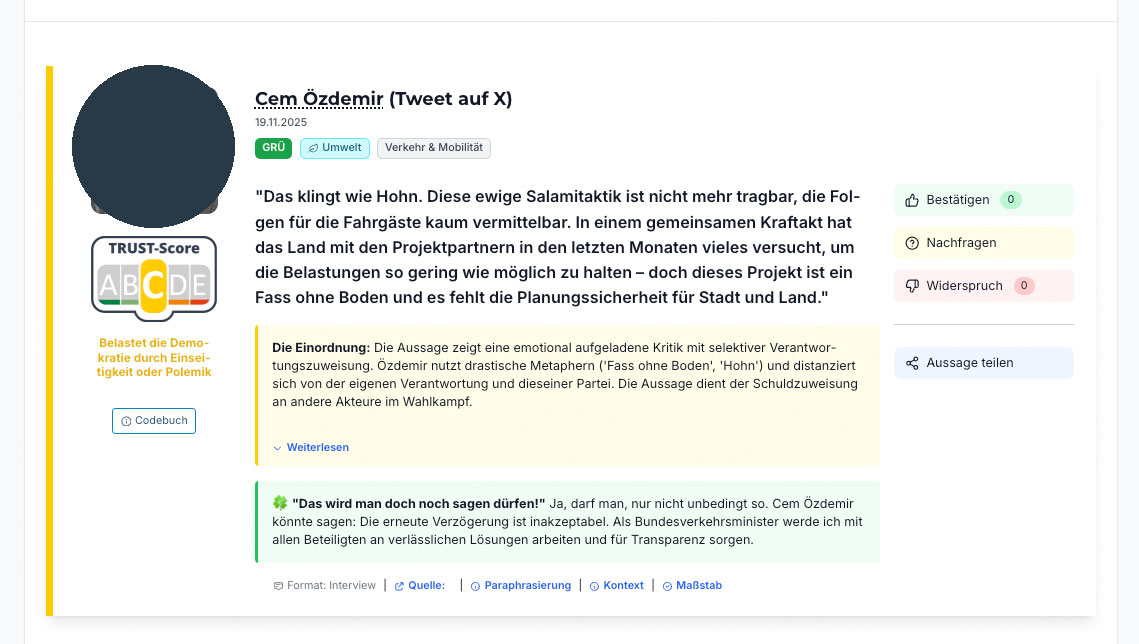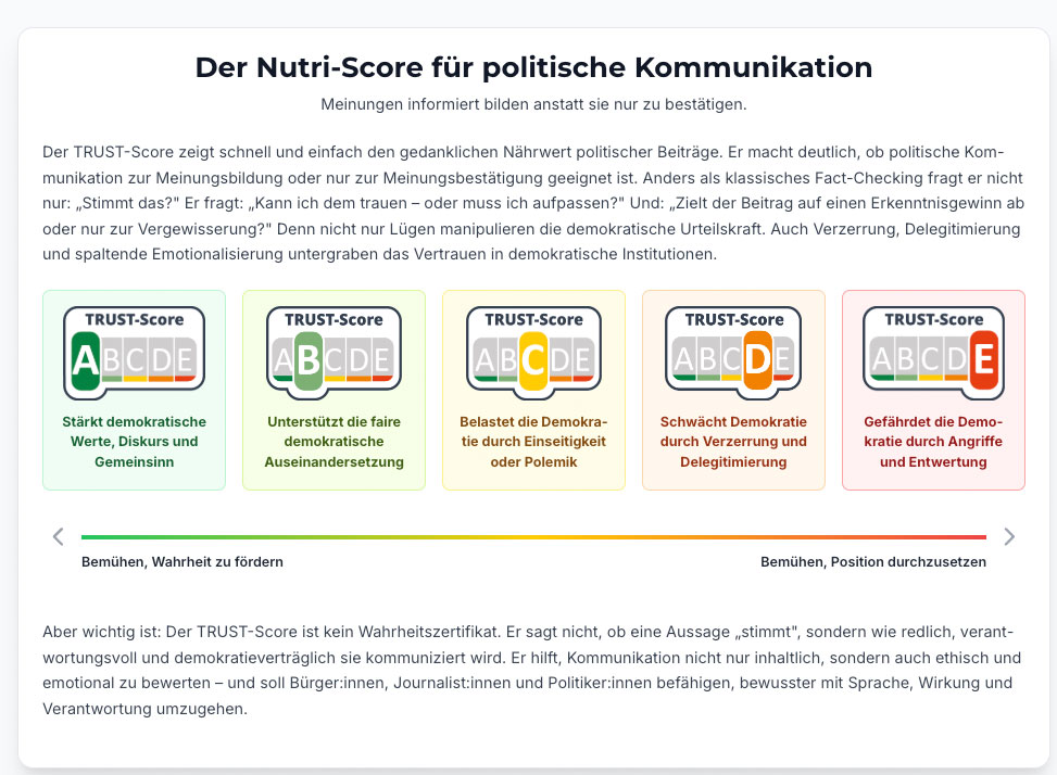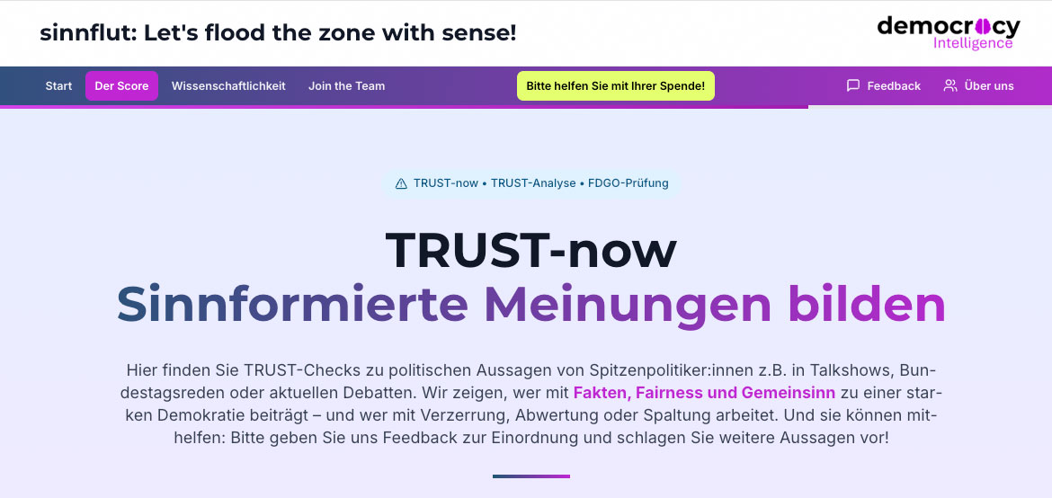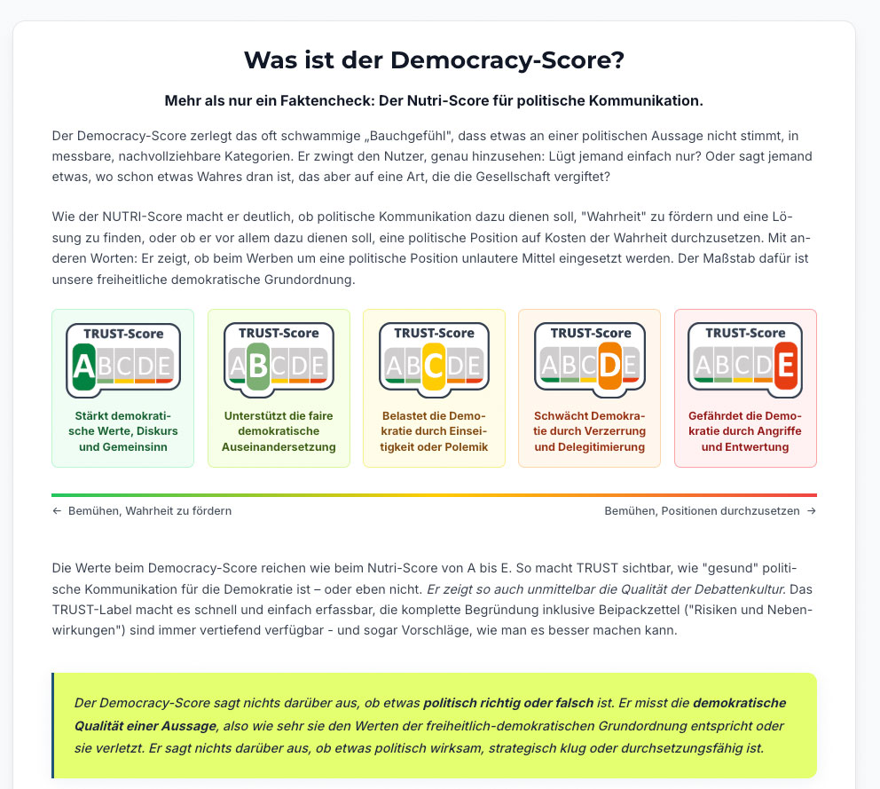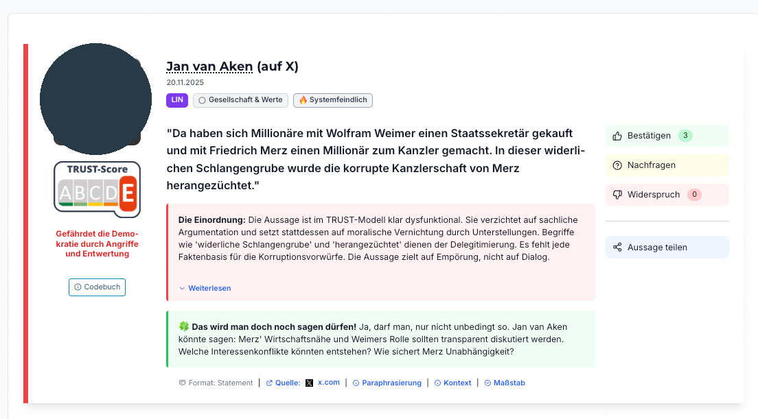 Screenshot vom 24. November 2025: „TRUST“ mache sichtbar, wie „gesund“ politische Kommunikation für die Demokratie sei. Der „Democracy-Score“ messe, wie sehr eine Aussage „den Werten der freiheitlich-demokratischen Grundordnung entspricht oder sie verletzt“, obwohl für solche Entscheidungen Gerichte zuständig sind. Dies sei gemeinnützig, so Gründer Mirko Lange. Zugleich unterstellt er („Trust-Score“ C), Polemik belaste die Demokratie, obwohl das Bundesverfassungsgericht auch polemische Meinungsäußerungen für zulässig erklärt.