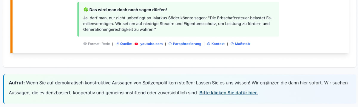 Andererseits sagt die gGmbH zu, willkürlich eingereichte „demokratisch konstruktive Aussagen von Spitzenpolitikern“ zu ergänzen, und zwar „sofort“: