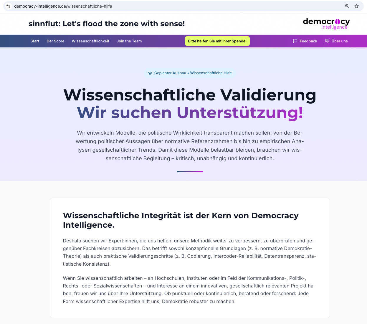 Screenshot von der Seite https://democracy-intelligence.de/wissenschaftliche-hilfe vom 24. November 2025: Die Methode soll „gegenüber Fachkreisen“ abgesichert werden – offenbar sind Fachkreise Gegner. Warum steht da nicht sachlich „fachlich abgesichert“? Und mit der Äußerung „Jede Form wissenschaftlicher Expertise hilft uns, Demokratie robuster zu machen“ wird unterstellt, das Modell mache selbstredend die Demokratie robuster. Dabei muss sich genau das noch erweisen. Der Effekt, der erst nachgewiesen werden muss, wird hier einfach behauptet.