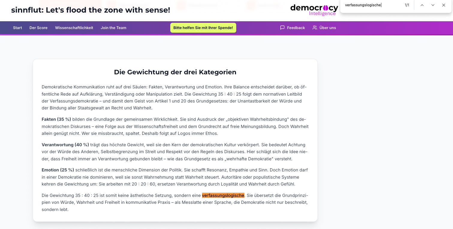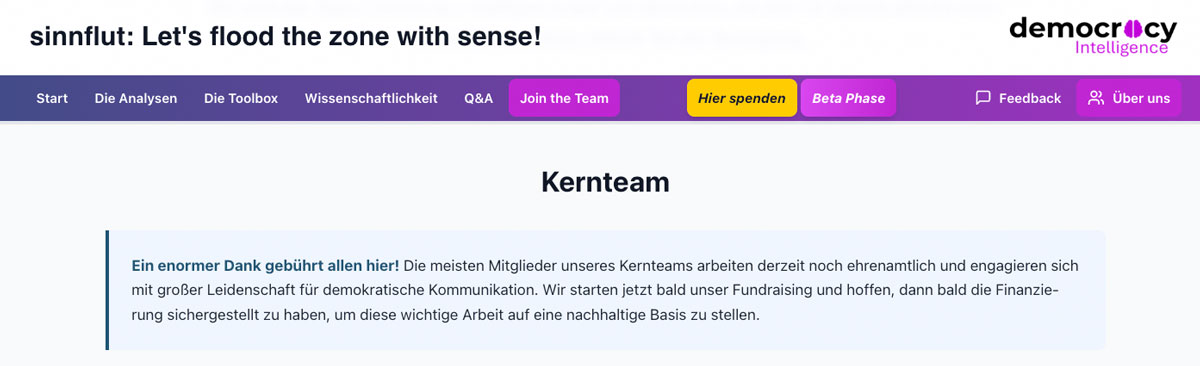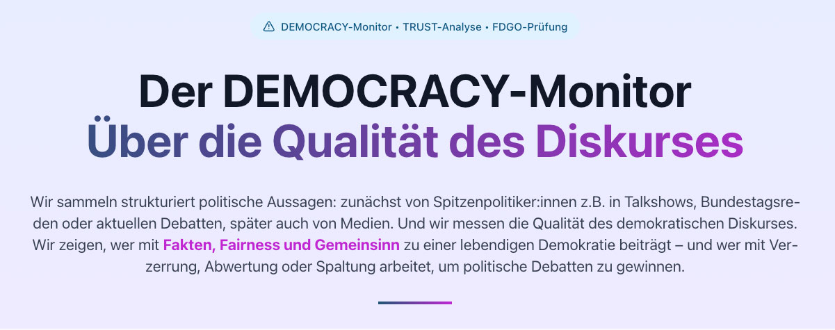 Auffällig ist die hohe Dichte an Buzzwords. Die Website ist voll von Wortwucht, hinter der unbedarfte Menschen Substanz vermuten, ohne dass diese Substanz belegt würde. Es geht um ein „umfassendes Ökosystem für demokratische Kommunikation und Transparenz“, „eng an wissenschaftlichen Standards orientiert“. Doch was bedeutet das alles inhaltlich?