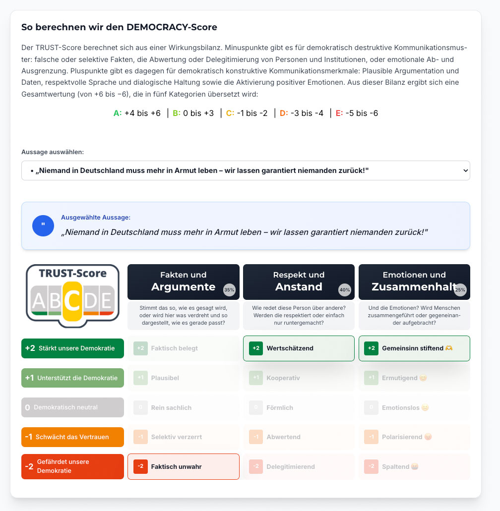 Seit September 2025 nun bewertet die „Democracy Intelligence gGmbH“ mit ihrem „Democracy-Score“ (vormals „Trust-Score“, davor „Desinfo-Score“, bei der Volkshochschule Gütersloh ist die Rede vom „Sinnflut Score“) Äußerungen von Politiker/-innen. Und sie vergibt dafür Noten: