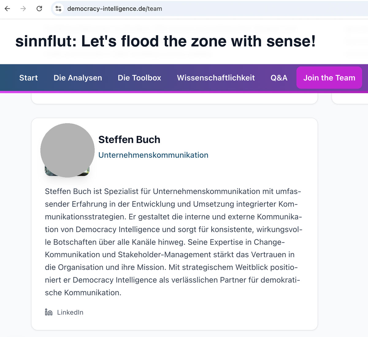 Von seiner Tätigkeit als „Unternehmenskommunikation“ bei der „Democracy Intelligence gGmbH“ steht auf Steffen Buchs LinkedIn-Profil Stand heute nichts – obwohl er laut der gGmbH-Seite bereits sehr umfassend aktiv sein müsste. Dort ist zu lesen: