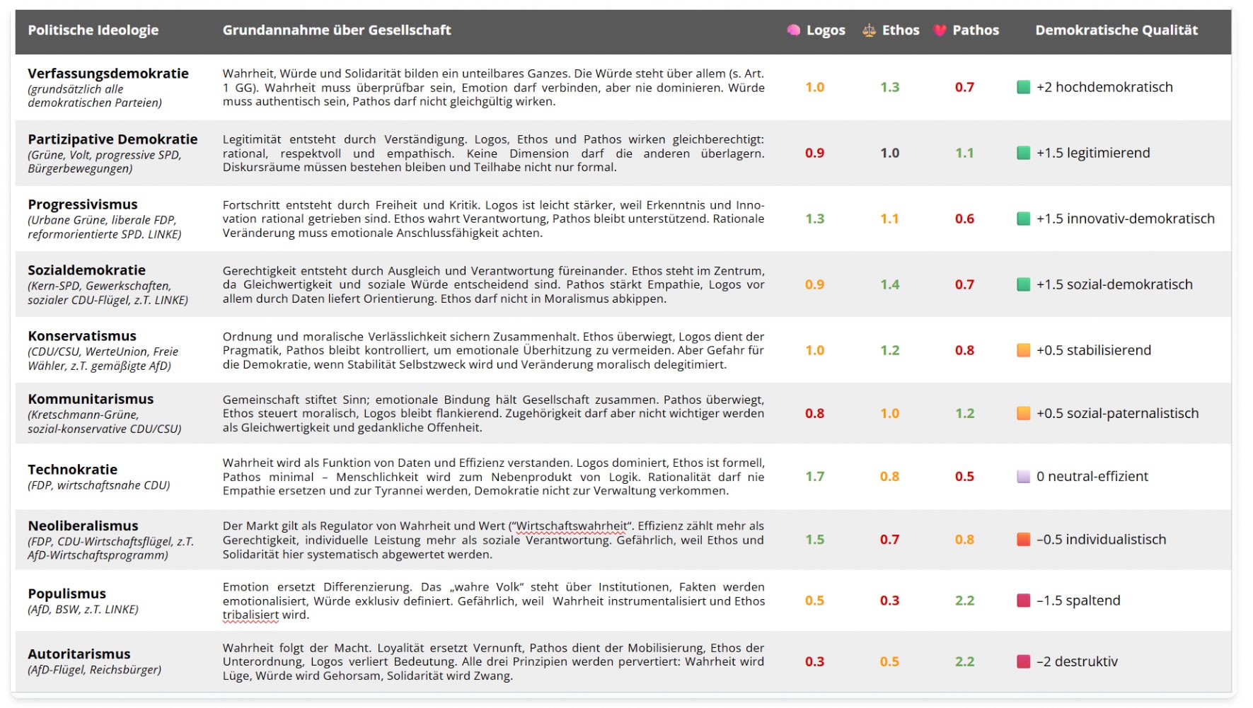 Wie unschwer zu erkennen ist, ordnet die gGmbH die Grünen und Volt der „partizipativen Demokratie“ zu und bewertet sie mit „+1,5 legitimierend“, während der Konservatismus mit CDU und CSU (in einen Topf geworfen mit den Freien Wählern und der WerteUnion) nur den Wert „+0,5 stabilisierend“ bekommt.
