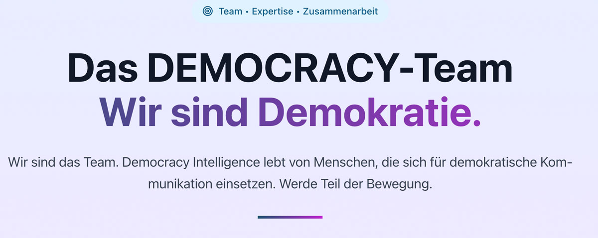 Und: „Wir sind Demokratie“ heißt es über dem „Kernteam“. Kommunikationsprofis erkennen die Rhetorik: mehr Pathos als Inhalte. Es geht ums Emotionalisieren, nicht ums Informieren. Es klingt gut, ist aber hohl. In jedem Fall solange das „Wir“ nicht nachvollziehbar ist und wir auf dem LinkedIn-Profil von Steffen Buch nur etwas von Melitta lesen und nichts von der „Democracy Intelligence gGmbH“. Oder solange uns Mirko Lange nicht transparent macht, wer die von ihm behaupteten beteiligten Wissenschaftler/-innen nun sind.